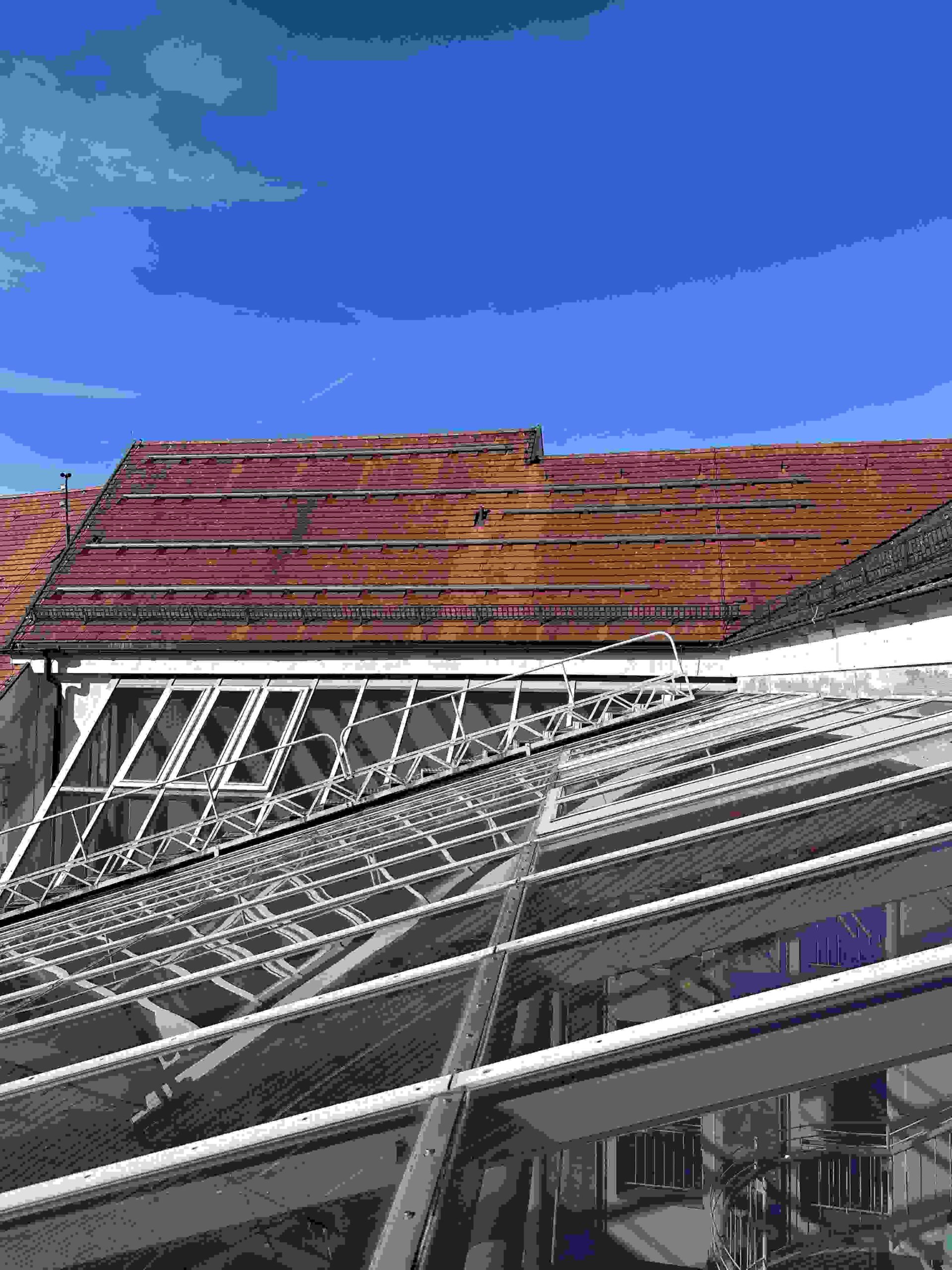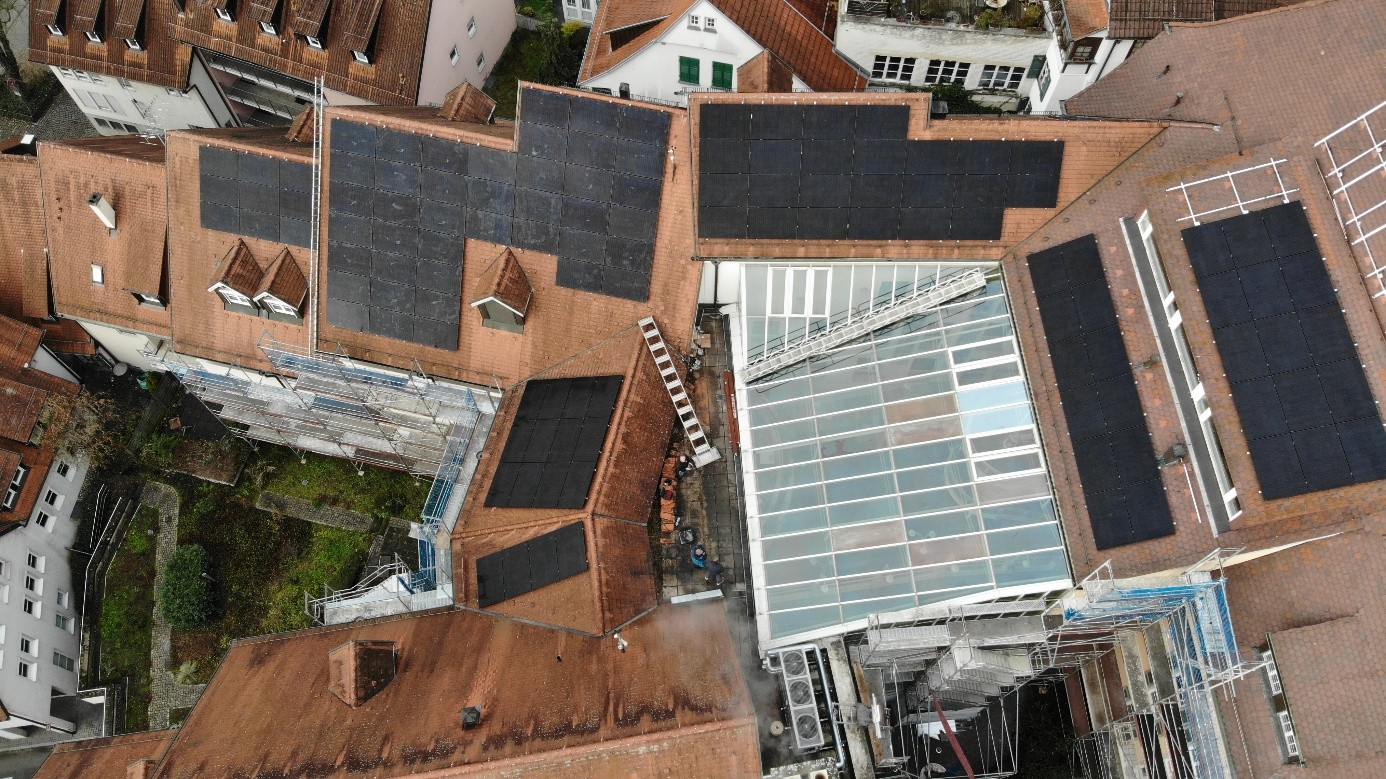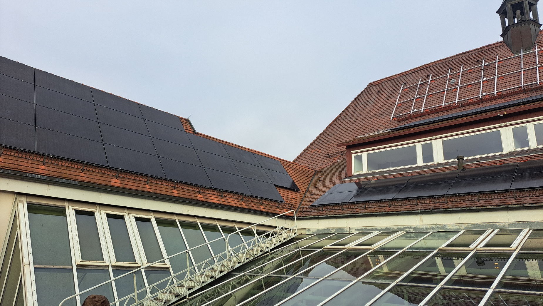 Ansicht Rathausdach mit rotem Modulfeld wg. Denkmalschutz