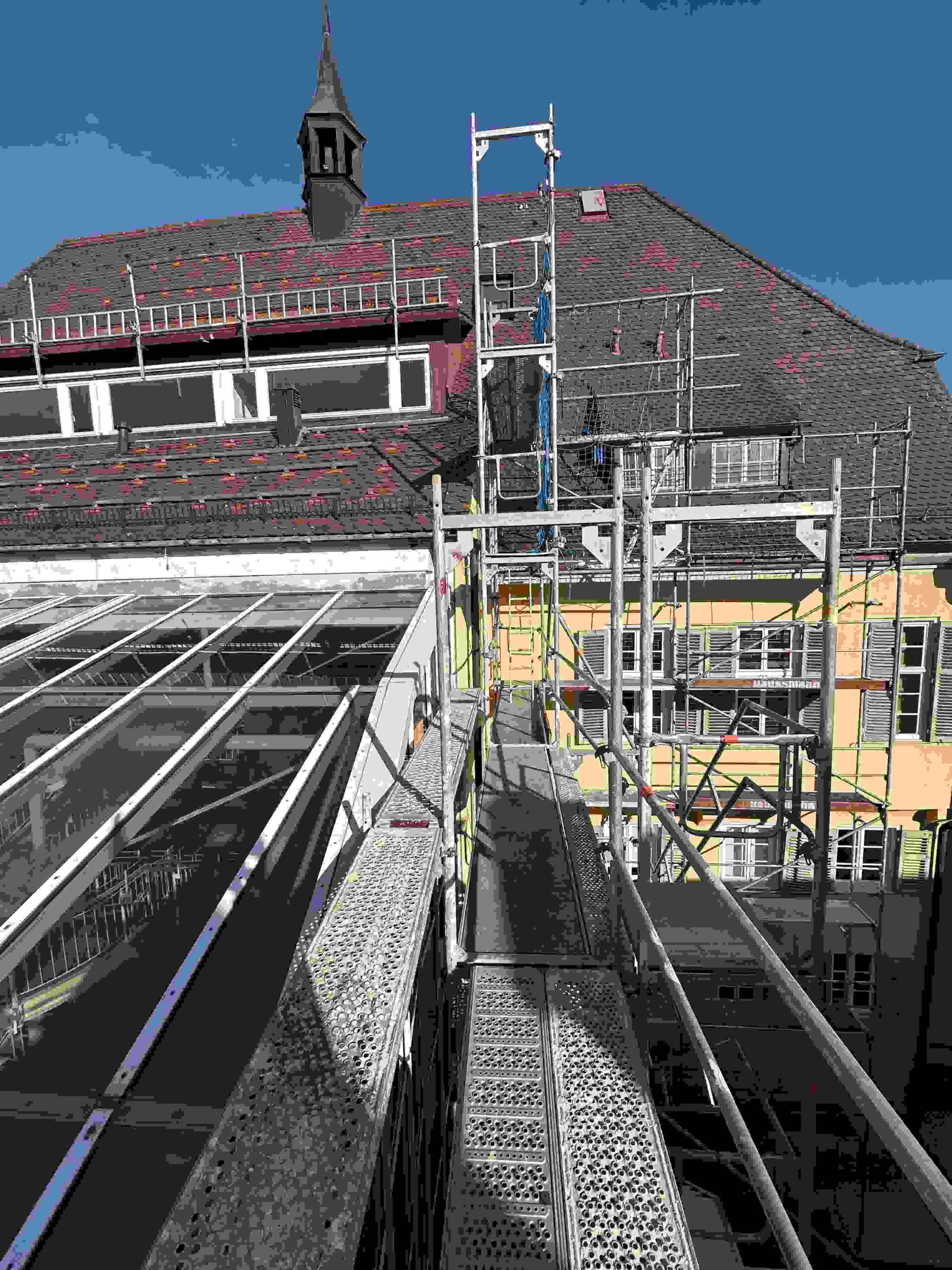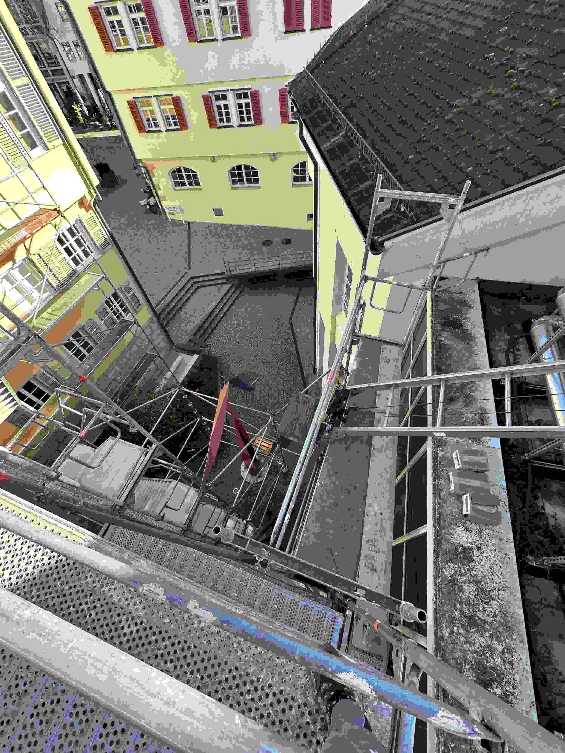 Nach verzögertem Aufbau des Gerüsts und anschließendem schlechten Wetter konnte die beauftragte Fa. Hummel nun endlich mit der Montage des Untergestells beginnen.